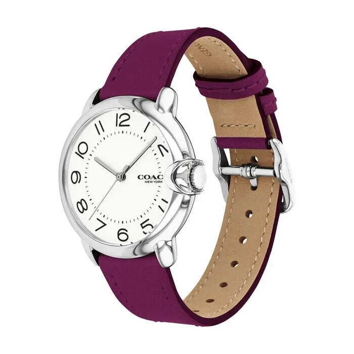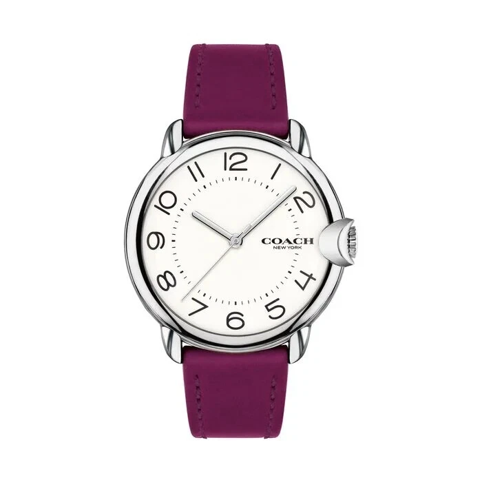 Silver-tone stainless steel case with a magenta leather strap. Fixed silver-tone stainless steel bezel. White dial with silver-tone hands and numeric numeral hour markers. Dial Type: Analog. Quartz movement